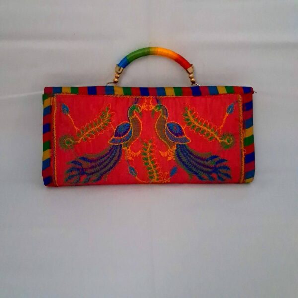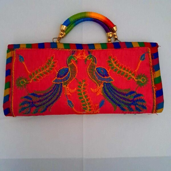 Peacock embroidered colorful clutch bag with rainbow handles.